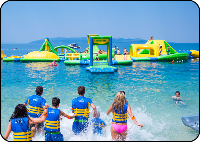 niños jugando en juegos acuaticos sobre el mar