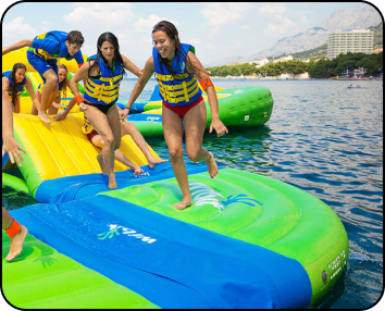 niños jugando en juegos acuaticos sobre el mar